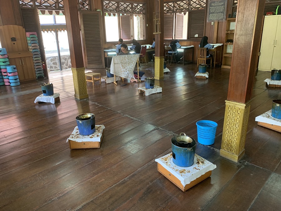 バティック(Batik)とは、インドネシアやマレーシア伝統のろうけつ染めの生地の特産品のことで、日本では更紗の一種とされています。特にジャワ島のものが有名なため、「ジャワ更紗」と呼ばれることもりあります。ここでは、バティック鑑賞だけでなく、自分のオリジナル作品を作りながらインドネシアの伝統文化を学ぶことができます。テキスタイル博物館の裏庭にある建物に体験型ワークショップがあり、バティック(ろうけつ染め)作りが体験できます。部屋にはエアコンはないのですが、高床式で風が通る作りになっているのでそこまで暑くはありません。ワークショップの担当者が、片言の英語とインドネシア語でお手本をゆっくり見せてくれるので、インドネシア語が分からなくても大丈夫です。在住者はKITAS(在留証明)を提示でIDR40,000(約350円)、観光客はIDR75,000(約650円)で受けることができます。