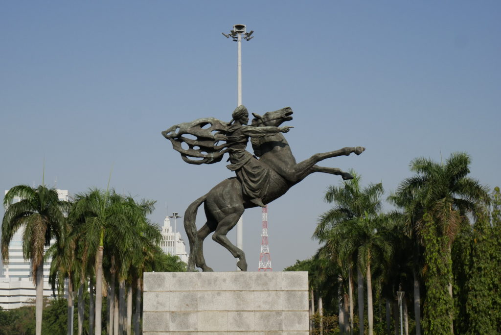 ろうそくやたいまつのように見える塔の外装は白い大理石で作られていて、高さは137メートルもあります。そして頂上部の炎のレリーフ部分に着目しますと、高さ14メートル、直径6メートル、重さが14.5トンの青銅製で77個のパーツから構成されています。また、表面には35kgの純金めっきが施されています。この炎のレリーフは「アピ・ナン・タッ・クンジュン・パダム(Api Nan Tak Kunjung Padam)」と呼ばれ、意味は「消える事のない火(=永遠に燃え続ける火)」で、独立戦争当時のインドネシア国民の闘志、すなわち決して消えることのないインドネシア人の魂を象徴しています。