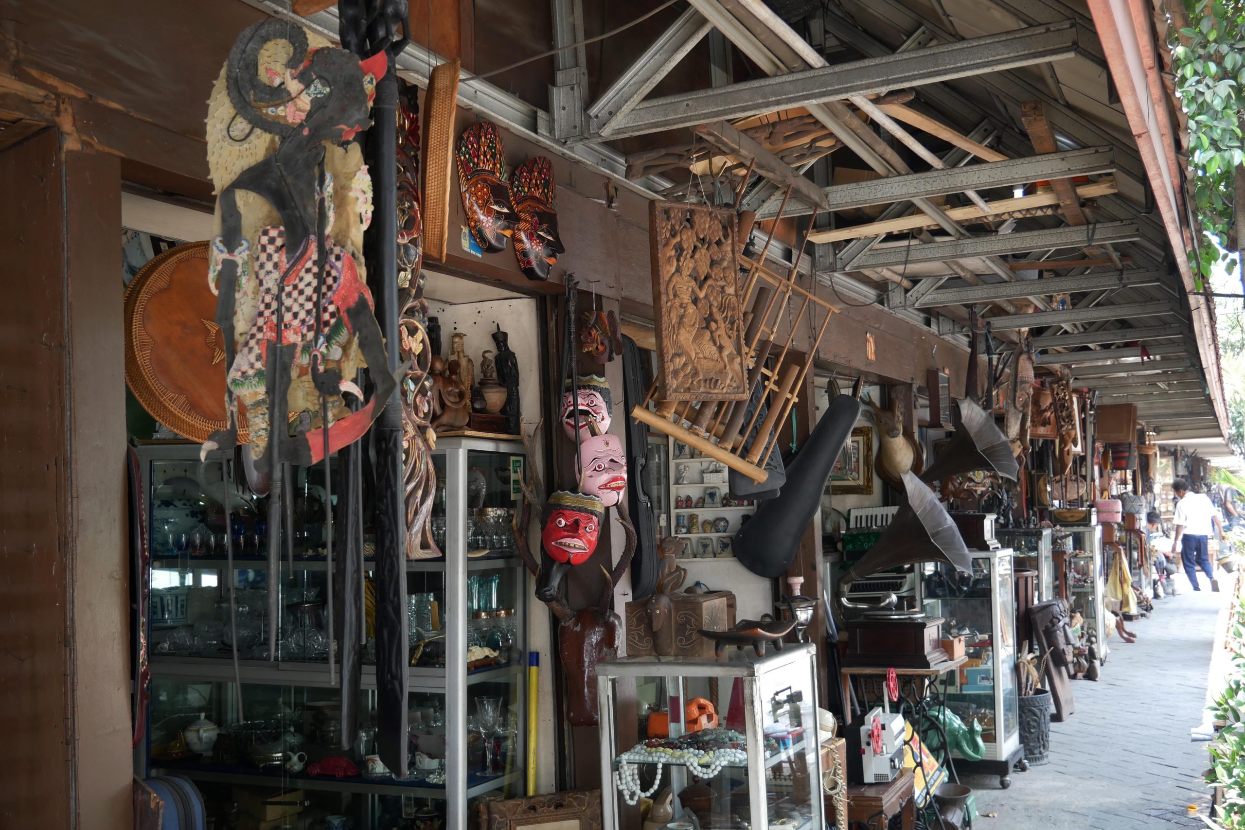 さて、このスラバヤ通りの骨董品に話を戻しましょう。陳列されている品物は本当にバラエティーに富んでいます。販売されている物はインドネシアの骨董品だけではなく、各国から流れ着いた珍しい品々、オランダ統治時代の陶磁器など、様々なものが混在しています。入り口に置かれているお人形、木彫りの仮面、シャンデリア、銀食器、コイン、アンティークの扇風機、タイプライター、電話、絵画、カメラ、レトロな蓄音機、いかにも年代物といった感じのする陶磁器など本当にいろいろな品物が売られています。どのお店も基本的に決まった価格は表示されておらず、お店のオーナーとの交渉で金額が決まります。言い値のまま購入する人はいないと思いますが、インドネシアの友人によると通常は20%~30%ぐらいは値下げできるので、しっかり交渉してみてと言われました。ただし、いかにも偽物のアンティークじゃないのかしらと思えるものも数多くありますので、ある程度目利きできないと不安になります。しかし、国内だけではなく、国外のコレクターも注目する市場ですし、掘り出し物がいっぱいあるのは間違いない場所です。普段は閑散としていますが、週末には結構人が集まります。