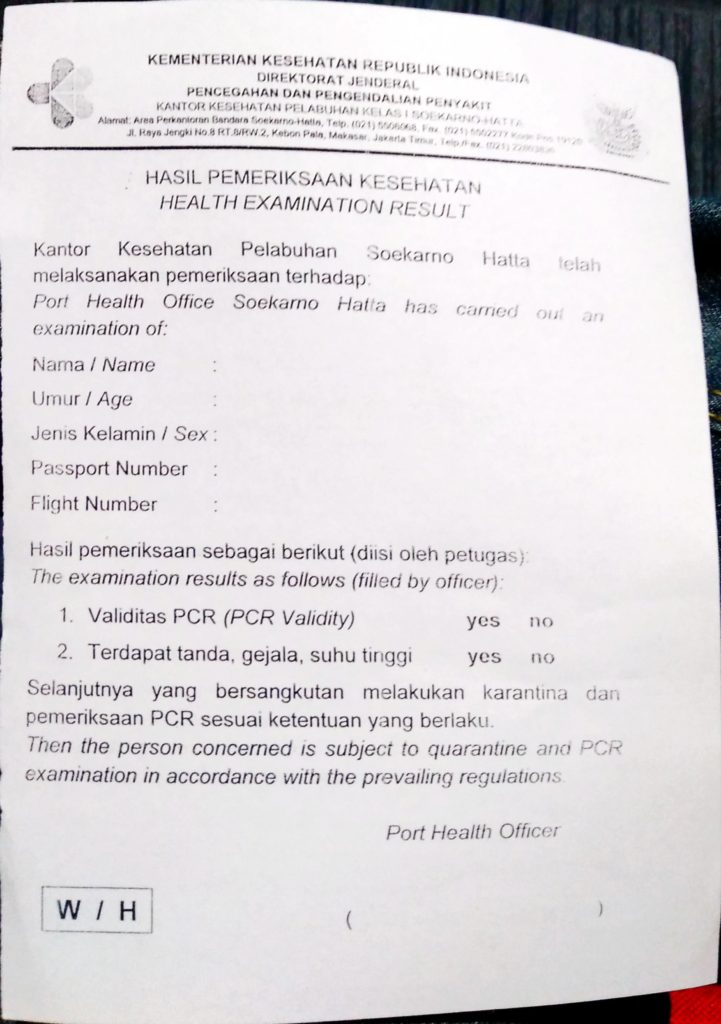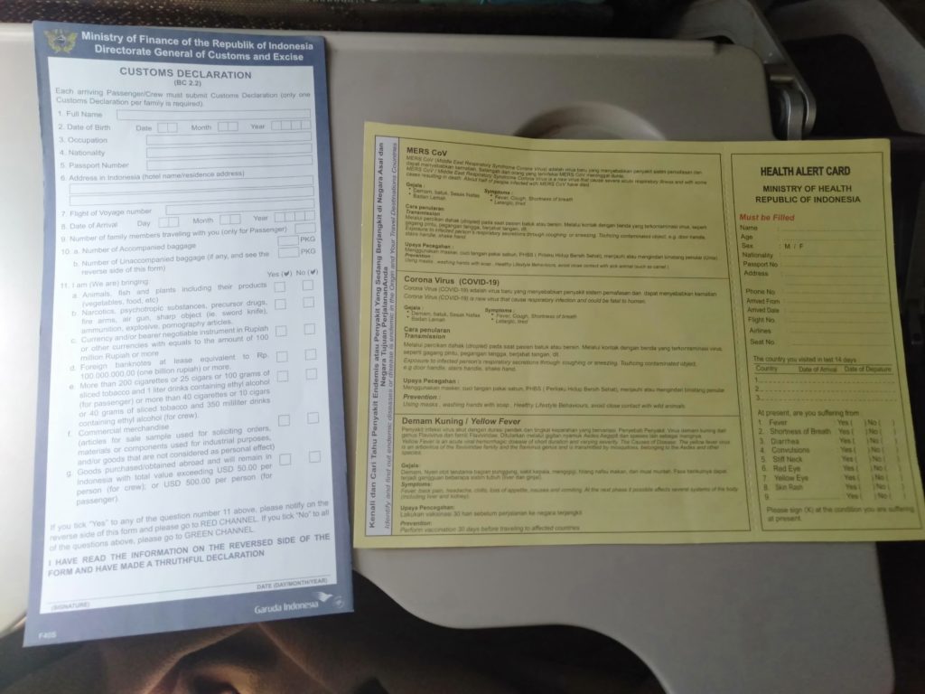 黄色の健康チェックカードには、上から順番に名前、年齢、性別、国籍、パスポート番号、インドネシアでの住所、電話番号、最終出発国、到着日、フライトナンバー、航空会社名、座席番号、この14日間で滞在していた国、そして健康状態を記入します。