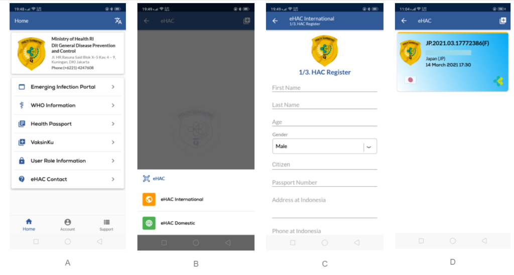これでアプリへの入力は終了です。Dの画面の水色のカードをタップするとQRコードが出現します。このQRコードをインドネシア到着後、検疫で提示することになっています。